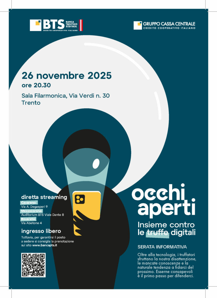 Le truffe online sono in costante aumento e rappresentano una minaccia concreta per la sicurezza di ciascuno di noi. Per questo Banca BTS e Gruppo Cassa Centrale organizzano una serata informativa aperta a tutti dedicata al tema delle frodi digitali e alla protezione dei propri dati.